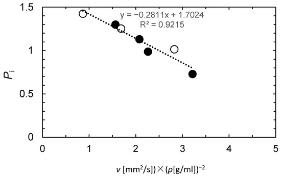 In both the oil (Figure 5a) and aqueous (Figure 5b) phases, a linear relationship was observed between f and f′. The slope of the line is represented by Pi (=f′/f). The correlation between Pi and the physical properties of the liquid is depicted in Figure 6. A linear relationship was obtained between Pi and the kinematic viscosity and density of the liquid.
