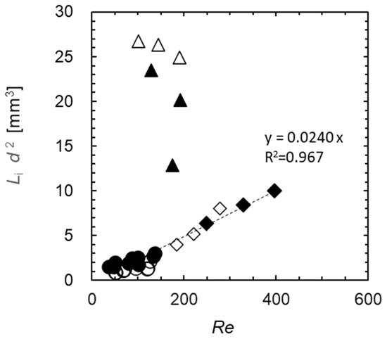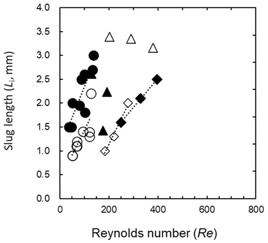 As clarified in the previous section, the slug length is proportional to the linear flow velocity (u). For example, as the μ value of the liquid increases, the flow rate decreases, and thus, the slug length decreases. In addition, if the inner diameter (d) of the pipe increases, Li decreases. The correlation of the relationships between u, μ, d, and can facilitate equipment design. Therefore, the data obtained thus far were arranged to correlate Li with the Reynolds number, Re, of the liquid, which was calculated using Equation (4).