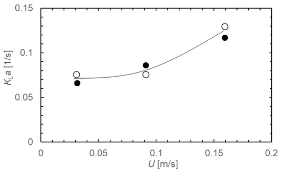 Figure 9 depicts the effect of the liquid flow velocity U [m/s] on the overall mass transfer coefficient, KLa, using a piezo micropump (●) and a syringe pump (○) (via the method shown in [22]). The slug flow generated by the interlocking of the two diaphragm piezo pumps used in this study could achieve the same extraction rate as that of the syringe pump frequently used in previous studies. KLa tended to increase with increasing U, suggesting that circulation flow occurred in each fluid, which is a characteristic of slug flow.