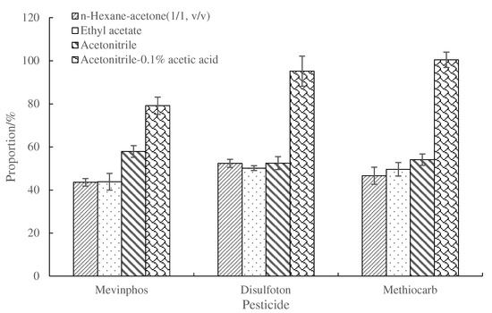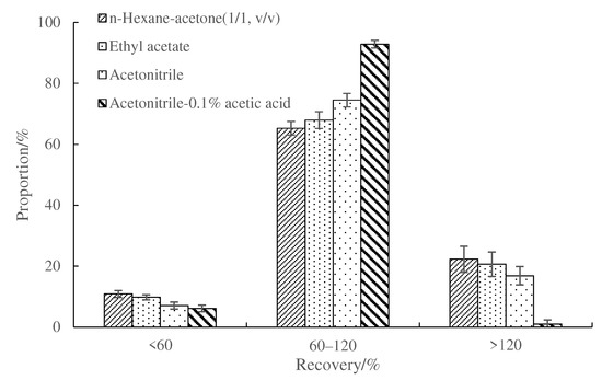 The pesticides investigated in this study include organochlorines, organophosphorus, and carbamates, which have large differences in solubility and polarity. Therefore, a solvent with high solubility is needed for a more efficient extraction of the pesticides. To achieve high-efficiency extraction, the amount of matrix compounds co-extracted from the complex tobacco matrix should be as low as possible. According to literature, n-hexane–acetone mixture, ethyl acetate, acetonitrile, and acetonitrile–0.1% acetic acid are the most commonly used extraction solvents [20,21,22,23]. In this study, the effects of these four solvents on the 209 pesticide residues in tobacco were investigated; the recovery ranges of the target pesticides obtained upon extraction by these solvents are shown in Figure 2. The results showed that when acetonitrile–0.1% acetic acid was used as the extraction solvent, the proportion of pesticides with recoveries in the range of 60–120% was the largest. Moreover, as shown in Figure 3, the use of acetonitrile–0.1% acetic acid as the extraction solvent resulted in significant improvement in the recovery of some carbamates and organophosphorus pesticides with strong polarity, such as mevinphos, disulfoton, and methiocarb and a drift in the retention time was observed. This result was in accordance with that of a previous study [24]. Thus, acetonitrile–0.1% acetic acid was chosen as the optimal extraction solvent.