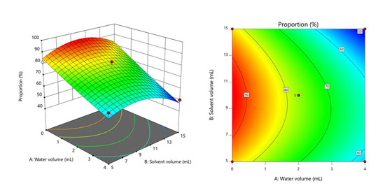Response surface and contour diagram of R = f (A, C) with a 10 mL solvent volume.