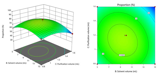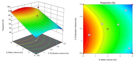 Response surface and contour diagram of R = f (A, B) with a 1.2 mL purification volume.