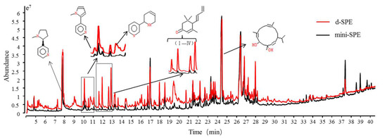 The total ion chromatography (TIC) chromatograms of the tobacco extracts obtained by mini-SPE (black) and dispersed-SPE (d-SPE; red) are shown in Figure 7. The mini-SPE-treated sample showed a lower TIC chromatographic baseline, indicating the stronger ability of mini-SPE to remove impurity interferences, especially alkaloids such as nicotine, nicotyrine, and (R,S)-anatabine. In addition, the ability of mini-SPE to remove megastigmatrienone-I, II, III, and IV, which are important aroma components in tobacco, was stronger, with only a small amount of megastigmatrienones present in the solution after extraction. The two purification methods showed similar abilities for the removal of 4,8,13-duvatriene-1,3-diol, a major glandular trichome secreted by tobacco. In general, mini-SPE can effectively clean up alkaloids, aroma components, and pigments. Moreover, mini-SPE requires few steps and is simple, making it an excellent pretreatment method for rapid detection.