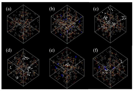 Then, the initial models of the membranes were established using the “amorphous cell” module. The lattice type was set as cubic, and the final density of the cell was set as 0.97 g/cm3. The output was 10 cells. In order to prevent any interaction between the polymer chains, only one chain was placed in each cell, and the cells initially had a low density (0.1 g/cm3). The cells with the lowest energy were selected for further optimization. Different gas molecules were loaded into PDMS cells to obtain simulation systems for each gas. A total of five gas molecules were put into each model. For the model of mixed gas, one N2 molecule and four C3 molecules were put into each system. Then, the “smart minimizer” method was used to minimize the system energy and relax the structures. For the minimization process, the convergence level was set to 0.001 kcal mol−1 Å. Afterwards, the cells were annealed in the “anneal” module, gradually heated from 200 K to 600 K, and then cooled to 200 K again. The process was repeated five times. With high-temperature relaxation, the distribution of holes was closer to that of the real material. Then, 100 ps MD simulations were performed successively in the NVT ensemble and the NPT ensemble at 298 K for the final optimization. The structures of the membrane cells are presented in Figure 1.