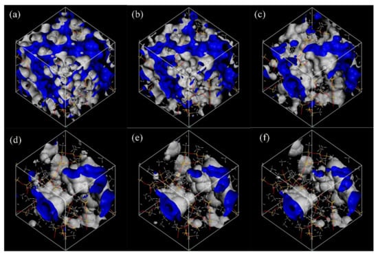 Accessible spaces determined by setting different Connolly radiuses for the probes: (a) 0 Å, (b) 0.5 Å, (c) 1 Å, (d) 1.8 Å, (e) 2.2 Å, and (f) 2.5 Å (blue and white represent the free volume field).