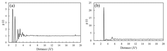 Then, the RDF of PDMS membrane atoms was calculated. The results are presented in Figure 3. Figure 3a shows the RDF of all the atoms of the PDMS. It is observed that the atoms of the PDMS lack long-range order, indicating that the polymer is amorphous. As the distance is shorter than 1 Å, the peak intensity is zero, indicating that the distance between the atoms is larger than 1 Å, which reflects the mutual repulsive force between the atoms. Figure 3b shows the RDF between the Si atoms and the C atoms of the branch chain. The radial distribution between the C atoms and the Si atoms has a sharp peak at 2.25 Å. This is the bond length of the C-Si bond.