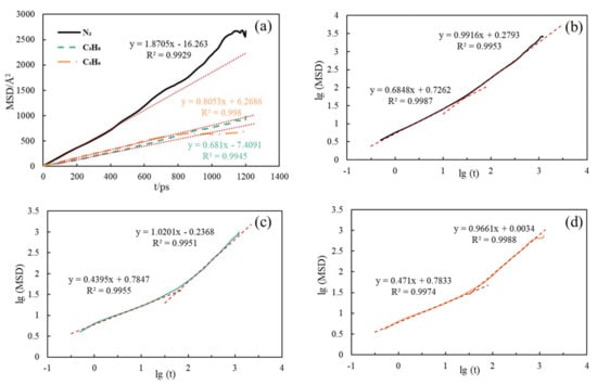 The MSD−t curve for the transport of C3/N2 (a) and the lg (MSD) −lg (t) curve for the transport of N2 (b), C3H8 (c) and C3H6 (d).