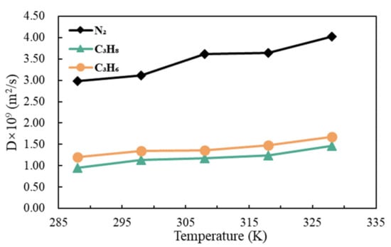 Figure 5 shows the diffusion coefficients of N2, C3H8 and C3H6 in the PDMS membrane at temperatures of 288 K, 298 K, 308 K, 318 K and 328 K. With a temperature increase from 288 K to 328 K, the diffusion coefficients gradually increase as well. Equation (1) is based on the Arrhenius formula []: