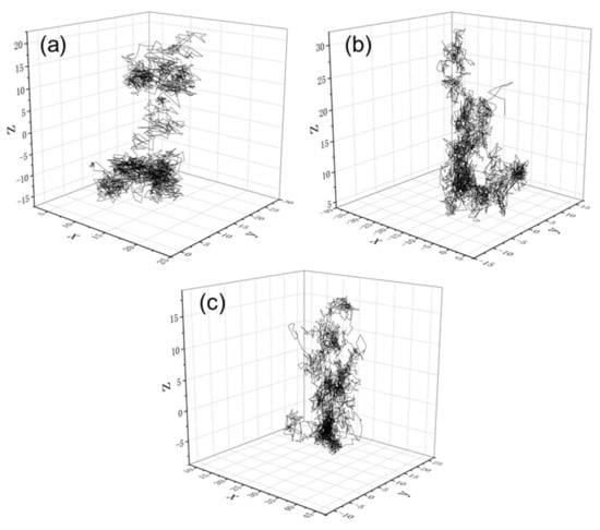 Figure 6 shows the trajectories of the three gases at 298 K. The gases jump among holes in PDMS in the diffusion process. The space ranges that gases reach are determined by the magnitudes of the diffusion coefficients. The diffusion range of N2 is larger than that of C3. Because the volume of N2 molecules is smaller, they can reach some holes with a volume smaller than that of C3 molecules, and the diffusion coefficient of N2 is larger than that of C3, that is, N2 has a higher diffusion rate. Therefore, N2 has the largest diffusion range.