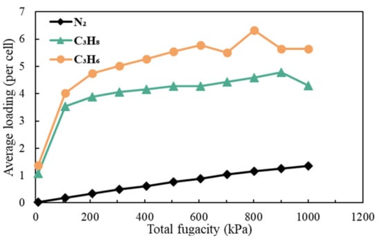 Figure 7 shows the adsorption isotherms of all three gases on the PDMS membrane at 298 K. At the same temperature and pressure, the number of gas molecules adsorbed by PDMS decreases in the order of C3H6, C3H8 and N2. With an increase in pressure, the number of molecules adsorbed on the PDMS membrane gradually increases. When the pressure reaches 200 kPa, C3H8 and C3H6 reach the adsorption equilibrium, and the number of adsorbed molecules remains unchanged. However, N2 does not reach the adsorption equilibrium, even as the pressure reaches 1000 kPa. This is because interactions of N2 with PDMS chains are rather limited, compared to those of C3H8 and C3H6. Even at lower pressure, PDMS can absorb sufficient C3H8 and C3H6 and reach equilibrium, but for N2, at pressures as high as 1000 kPa, we can observe that the amount of N2 absorbed is still low and that there are still spaces in PDMS for more N2. As a result, an equilibrium is not reached.