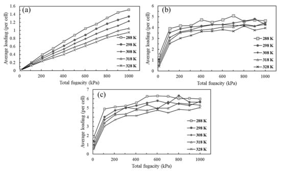 Figure 8 shows the adsorption isotherms of all three gases in the PDMS membrane at different temperatures. At the same pressure, as the temperature increases, the number of adsorbed molecules for all three gases on the PDMS membrane decreases. As a result, though N2 molecules are smaller, the number of molecules adsorbed is lower than for both C3 molecules. This is contrary to the case of diffusivities. Smaller N2 molecules have higher diffusivities than both C3 molecules.