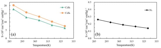 The solubility coefficients for the three gases, as pure gases and as mixed gases, in PDMS at 298 K are shown in Table 4. The competitive adsorption of gases in mixtures leads to a decrease in the solubility coefficients, and the decrease in the solubility coefficient of C3 is greater than that of N2.