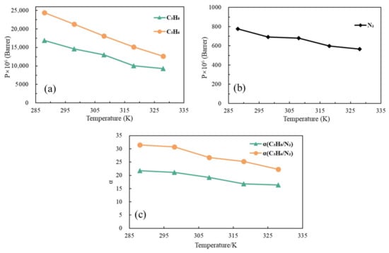 Permeability coefficients of (a) C3 and (b) N2, and (c) the selectivity coefficient of N2, C3H8 and C3H6 at different temperatures.