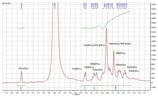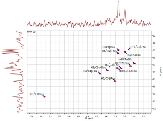 In addition, the signal at 92.13 ppm is suggestive of the α glycosidic configuration of glucose, which is in good accordance with what was found by Medlej et al. [37]. For a further structural clarification of KWSP, the HSQC spectrum is presented in Figure 3, where the correlations between 13C and 1H signals are illustrated. The structure of the produced polysaccharide proved to be composed of fructose and glucose, which is set forward in Table 3.
