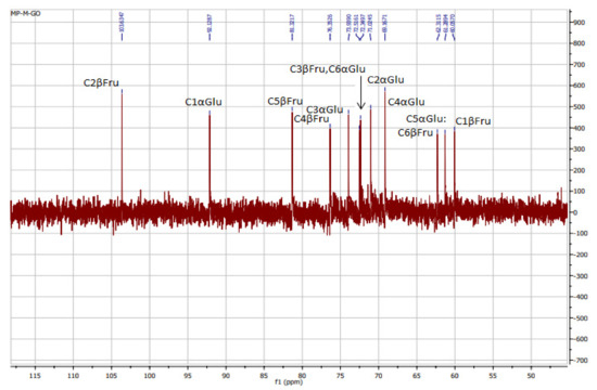 It is obvious from Figure 2 that 103.63 was the signal area of C2, and this was confirmed by the chemical shift of an anomeric carbon in β linkage (103–105 ppm) [36]. However, the signals at 60.05, 72.51, 76.24, 81.19, and 62.17 ppm were attributed to C1, C3, C4, C5, and C6 of fructose rings, respectively.