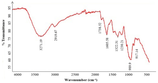 The FT-IR spectra of the purified polysaccharide (Figure 4) highlight the characteristics peaks of KWSP at 3271, 2919, 1738, 1605, 1322, 1230, 989, and 917cm−1. The peak at 3271 cm−1 indicates the stretching vibration of the OH groups due to inter- and intra-molecular hydrogen bands [38]. The peak at 2919 cm−1 corresponds to the stretching of the CH groups of free sugars [39]. Furthermore, the absorption observed at 1738 cm−1 determines the existence of the carboxylate CO bonds in the acylamino group, corroborating the presence of proteins [38]. In addition, the FT-IR spectrum suggests that the region between 1605 and 1500 cm−1 reflects bound water [40]. The most important peaks refer to those observed at 1322 cm−1 and 1230 cm−1 obtained from the bending vibration of the stretching vibration of the ester sulfate groups (S=O) of sulfate, as previously elaborated in the literature [41]. The absorption at 980 cm−1 can be assigned to the (C-O-C) group [38].