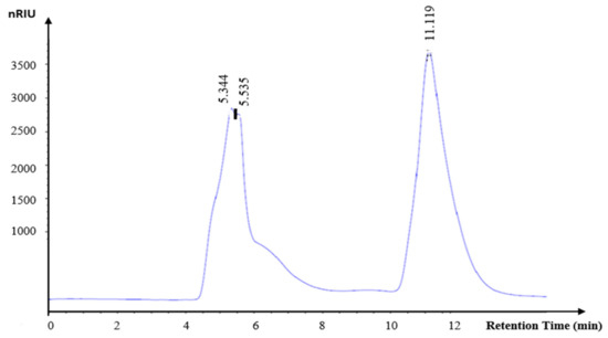 The monosaccharide composition of KWSP was explored through HPLC analysis. The chromatograms revealed two peaks at 10.21 min and 12.05 min for hydrolyzed KWSP (Figure 5), corresponding to those of the glucose and fructose, respectively, used as standards. The hydrolysis of KWSP contributes to the appearance of two plugs with retention factors of 0.7 and 0.75.