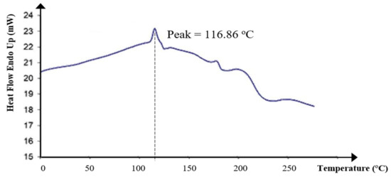 The glass transition temperature (Tg) of KWSP was shown by a peak at 116.86 °C, as portrayed in Figure 8. The heat of glass transition was 22.96 J/g. Basically, the heat of glass transition and exothermic peak corresponds to the capacity of the biopolymer to lose water. Furthermore, the polymer nature, as well as the temperature, may affect the Tg value.
