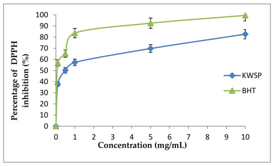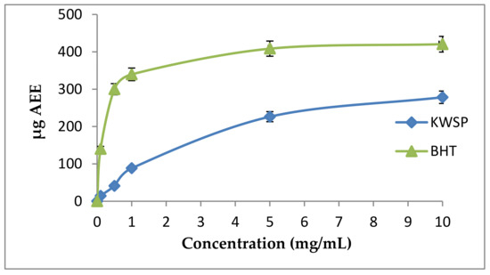 The phosphomolybdate method is also a quantitative test. The total antioxidant capacity is expressed as ascorbic acid equivalents (AAE). The total antioxidant capacity of the carbohydrate was determined to be 10 mg of KWSP, equivalent to 20 μg ascorbic acid. The obtained results were lower than BHT (Figure 11). Furthermore, our findings were similar to that of a previous work elaborated by Ben Slima et al. [18].
