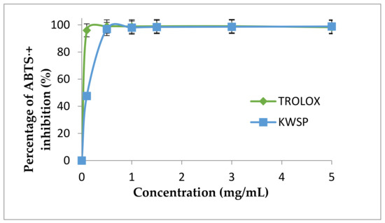 The ABTS⋅+ radical scavenging activity of KWSP was estimated according to the method of Braca et al. [21] with minor modifications at different concentrations (0.1 to 5 mg/mL). The absorbance of the mixture was specified spectrophotometrically at 734 nm. Trolox was the standard control. The ABTS⋅+ radical scavenging activity was identified with Equation (4).