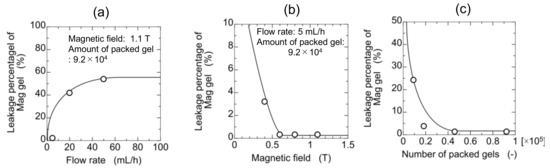 The Mag gel suspension (40 wt%) was inserted into a glass column (I.D. 1 mm) with the application of a magnetic field (TM103-15045-0560, Tesura Corporation, Japan) connected with a power supply (PAN35-5A, Kikusui Electronics Corp., Japan), thus packing the Mag gel in the column. The flow rate of water, the strength of the applied magnetic field, and the amount of Mag gel were changed to examine the packing stability of the bed from the following leakage percentage, as shown in Equation (1), of the Mag gel. The concentration of Mag gel in the elution was determined by C-Chip with microscopy.