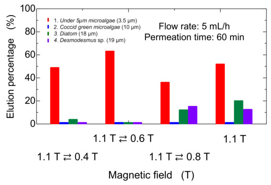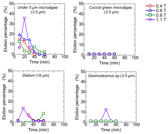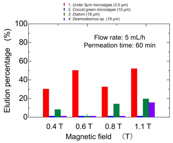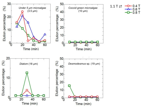 The mag gel was packed in a column at the constant magnetic field ranging from 0.4 to l. l T. After the injection of the microalgae suspension, the water was permeated. During the permeation, no elution of the Mag gel was checked. Time-course curves of the elution of each type of microalgae are shown in Figure 5. The Coccid green microalgae and Desmodesmus sp. were not eluted, whereas the microalgae at less than 5 µm and Diatom were eluted. In the case of microalgae at 5 µm at 1.1 T, the elution percentage reached 35% and decreased with time. At a lower magnetic field, the elution percentage of the microalgae gradually decreased. Because of the linear shape of Diatom, the elution percentage was 15%.