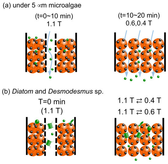 The microalgae suspension, including mainly four species, was injected into the bed top of Mag gel (height: 15 cm). The numbers of each microalgae (under 5 µm microalgae, Coccid green microalgae, Diatom, Desmodesmus sp.) were 1.9 × 104, 3.7 × 103, 3.0 × 103, and 2.0 × 103, respectively. The applied magnetic field was set at a static constant strength up to 1.1 T and at a dynamic convex change of 1.1 T ⇄ 0.4 T, 1.1 T ⇄ 0.6 T, and 1.1 T ⇄ 0.8 T. The magnetic field in the dynamic convex manner was changed at each interval of 10 min. Water was permeated through the bed by a syringe pump (S-1235, Atom Medical Corp., Japan) at the various flow rates for 60 min. The scheme is illustrated below in Appendix A.