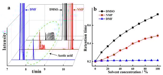 3.3. Chromatographic Separation of Acetic Acid in Three Polar Aprotic Solvents