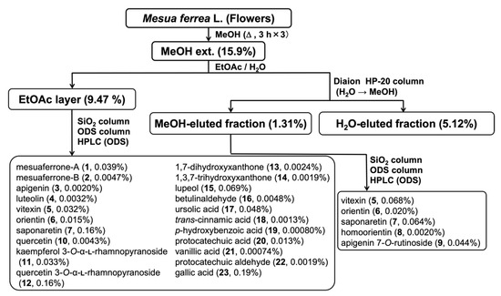 Dried flowers (986.2 g) of M. ferrea were extracted three times following reflux with methanol for 3 h. Solvent evaporation from the combined extracts under reduced pressure yielded an aqueous acetone extract (156.8 g, 15.9%). An aliquot (127.0 g) was partitioned in an EtOAc–H2O (1:1, v/v) mixture to furnish an EtOAc-soluble fraction (75.68 g, 9.47%) and an aqueous phase. The aqueous phase was subjected to Diaion HP-20 CC (2.0 kg, H2O→MeOH) to yield H2O-eluted (40.89 g, 5.12%) and MeOH-eluted (10.43 g, 1.31%) fractions. An aliquot (60.20 g) of the EtOAc-soluble fraction was subjected to normal-phase silica gel CC [3.00 kg, n-hexane–EtOAc (20:1→5:1→1:1→1:2, v/v)→EtOAc→MeOH] to yield seven fractions [Fr. E1 (0.49 g), Fr. E2 (2.02 g), Fr. E3 (19.70 g), Fr. E4 (11.10 g), Fr. E5 (4.67 g), Fr. E6 (1.17 g), and Fr. E7 (16.10 g)]. Fraction E2 (2.02 g) was subjected to reversed-phase silica gel CC [70.0 g, MeOH–H2O (80:20→95:5, v/v)→MeOH] to yield ten fractions [Fr. E2-1 (77.0 mg), Fr. E2-2 (163.7 mg), Fr. E2-3 (62.4 mg), Fr. E2-4 (87.1 mg), Fr. E2-5 (46.0 mg), Fr. E2-6 (91.9 mg), Fr. E2-7 (192.0 mg), Fr. E2-8 [=lupeol (15, 430.1 mg, 0.068%)], Fr. E2-9 (133.7 mg), and Fr. E2-10 (430.8 mg)]. Fraction E2-7 (436.8 mg) was analyzed using HPLC [detection: RI, MeOH-1% aqueous AcOH (95:5, v/v)] to yield 15 (7.1 mg, 0.0011%). Fraction E3 (19.7 g) was subjected to reversed-phase silica gel CC [600.0 g, MeOH–H2O (80:20→90:10, v/v)→MeOH] to yield eight fractions [Fr. E3-1 (78.0 mg), Fr. E3-2 (181.3 mg), Fr. E3-3 (127.2 mg), Fr. E3-4 (583.1 mg), Fr. E3-5 (193.1 mg), Fr. E3-6 (12.6 g), Fr. E3-7 (348.5 mg), and Fr. E3-8 (1.78 mg)]. Fraction E3-2 (181.3 mg) was analyzed using HPLC [detection: RI, MeOH-1% aqueous AcOH (60:40, v/v)] to yield 1,7-dihydroxyxanthone (13, 12.1 mg, 0.019%). Fraction E3-7 (348.5 mg) was purified by HPLC [detection: RI, MeOH-1% aqueous AcOH (95:5, v/v)] to yield betulinaldehyde (16, 15.5 mg, 0.0024%). Fraction E4 (11.05 g) was subjected to reversed-phase silica gel CC [330.0 g, MeOH–H2O (80:20→90:10, v/v)→MeOH] to yield 11 fractions [Fr. E4-1 (58.1 mg), Fr. E4-2 (473.6 mg), Fr. E4-3 (189.4 mg), Fr. E4-4 (799.1 mg), Fr. E4-5 (2301.3 mg), Fr. E4-6 (72.5 mg), Fr. E4-7 (920.0 mg), E4-8 (723.5 mg), E4-9 (254.6 mg), E4-10 (1050.0 mg), and Fr. E4-11 (734.2 mg)]. Fraction E4-1 (58.1 mg) was analyzed using HPLC [detection: UV (254 nm), MeOH-1% aqueous AcOH (20:80, v/v)] to yield p-hydroxybenzoic acid (19, 20.1 mg, 0.00080%), protocatechuic acid (20, 18.2 mg, 0.0018%), protocatechuic aldehyde (22, 5.6 mg, 0.0019%), and vanillic acid (21, 7.8 mg, 0.00074%). Fraction E4-2 (473.6 mg) was analyzed using HPLC [detection: UV (254 nm), MeOH-1% aqueous AcOH (50:50, v/v)] to yield quercetin (10, 27.2 mg, 0.00428%) and trans-cinnamic acid (18, 8.1 mg, 0.00128%). Fraction E4-3 (189.4 mg) was analyzed by HPLC [detection: UV (254 nm), MeOH-1% aqueous AcOH (50:50, v/v)] to yield 1,3,7-trihydroxyxanthone (14, 3.2 mg, 0.0020%). Fraction E4-4 (624.1 mg) was analyzed using HPLC [detection: UV (254 nm), MeOH-1% aqueous AcOH (60:40, v/v)] to yield apigenin (3, 8.6 mg, 0.0020%). Fraction E4-10 (300.0 mg) was analyzed using HPLC [detection: UV (254 nm), MeOH-1% aqueous AcOH (90:10, v/v)] to yield ursolic acid (17, 20.1 mg, 0.0048%). Fraction E5 (4.67 g) was subjected to reversed-phase silica gel CC [150 g, MeOH–H2O (40:60→60:40→70:30→80:20, v/v)→MeOH] to yield eight fractions [Fr. E5-1 (480.0 mg), Fr. E5-2 (250.0 mg), Fr. E5-3 (60.0 mg), Fr. E5-4 (110.0 mg), Fr. E5-5 (870.0 mg), Fr. E5-6 (420.0 mg), Fr. E5-7 (0.51 mg), and Fr. E5-8 (1.18 g)]. Fraction E5-1 (230.0 mg) was analyzed using HPLC [detection: UV (254 nm), MeOH-1% aqueous AcOH (5:95, v/v)] to yield 20 (71.0 mg, 0.0113%) and gallic acid (23, 37.6 mg, 0.0149%). Fraction E5-5 (300.0 mg) was characterized using HPLC [detection: UV (254 nm), MeOH-1% aqueous AcOH (60:40, v/v)] to yield mesuaferrone-A (1, 85.3 mg, 0.0387%), mesuaferrone-B (2, 99.8 mg, 0.0452%), and luteolin (4, 7.0 mg, 0.0032%). Fraction E5-6 (420 mg) was analyzed using HPLC [detection: UV (254 nm), CH3CN-1% aqueous AcOH (50:50 v/v)] to yield 2 (13.9 mg, 0.0022%). Fraction E7 (16.1 g) was subjected to reversed-phase silica gel CC [60.0 g, MeOH–H2O (40:60→60:40→70:30→80:20, v/v)→MeOH] to yield ten fractions [Fr. E7-1 (0.097 g), Fr. E7-2 (1.22 g), Fr. E7-3 (0.48 g), Fr. E7-4 (0.74 g), Fr. E7-5 (1.04 g), Fr. E7-6 (3.55 g), Fr. E7-7 (2.33 g), E7-8 (2.05 g), E7-9 (1.70 g), and Fr. E7-10 (1.50 g)]. Fraction E7-4 (300.0 mg) was analyzed using HPLC [detection: UV (254 nm), MeOH-1% aqueous AcOH (30:70, v/v)] to yield orientin (6, 13.9 mg, 0.0032%). Fraction E7-5 (500.0 mg) was characterized using HPLC [detection: UV (254 nm), MeOH-1% aqueous AcOH (30:70, v/v)] to yield vitexin (5, 14.6 mg, 0.0126%). Fraction E7-6 (500.0 mg) was analyzed using HPLC [detection: UV (254 nm), MeOH-1% aqueous AcOH (50:50, v/v)] to yield 5 (12.7 mg, 0.0140%), saponaretin (7, 89.5 mg, 0.100%), and quercetin-3-O-α-l-rhamnopyranoside (12, 135.4 mg, 0.151%). Fraction E7-7 (500.0 mg) was analyzed using HPLC [detection: UV (254 nm), MeOH-1% aqueous AcOH (40:60, v/v)] to yield 12 (17.0 mg, 0.011%) and kaempferol-3-O-α-l-rhamnopyranoside (11, 48.5 mg, 0.033%). An aliquot (8.20 g) of the MeOH-eluted fraction was subjected to reversed-phase silica gel CC [500 g, MeOH–H2O (35:65→50:50→70:30→90:10, v/v)→EtOAc→MeOH] to yield seven fractions [Fr. M1 (0.80 g), Fr. M2 (0.78 g), Fr. M3 (1.13 g), Fr. M4 (1.72 g), Fr. M5 (1.46 g), Fr. M6 (0.39 g), and Fr. M7 (1.48 g)]. Fraction M4 (500.0 mg) was subjected to HPLC [detection: UV (254 nm), MeOH-1% aqueous AcOH (50:50, v/v)] to yield five fractions {Fr. M4-1 (13.4 mg), Fr. M4-2 (3.4 mg), Fr. M4-3 (31.2 mg), Fr. E4-4 [=5 (51.7 mg, 0.028%)], and Fr. E4-5 [=7 (11.1 g, 0.0061%)]}. Fraction M4-3-1 (31.2 mg) was analyzed using HPLC [detection: UV (254 nm), MeOH-1% aqueous AcOH (35:65, v/v)] to yield homoorientin (8, 3.7 mg, 0.0020%). Fractio