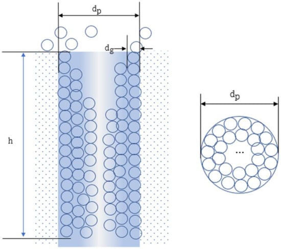 Geometric diagram of adsorbed gas molecules packing inside a typical straight, cylindrical microchannel. dp is the diameter of the pore, dg is the diameter of the gas molecule, h is the length of the pore channel.