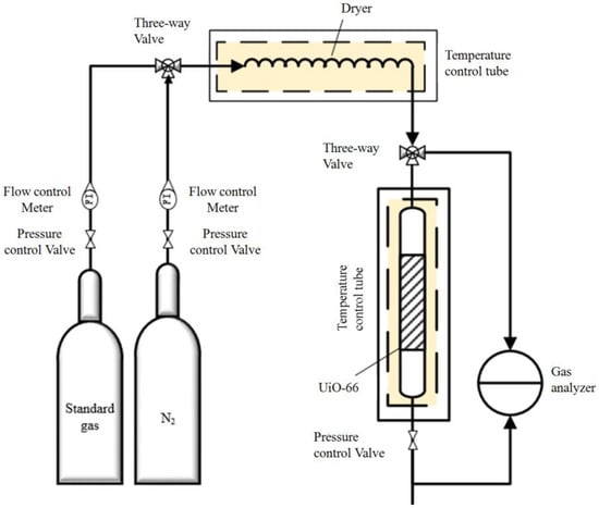 Adsorption experiments on two sizes of UiO-66 were carried out under dry conditions, as schematically presented in Figure 2. In a typical experiment, a 5.0 cm long organic glass column with an inner diameter of 0.5 cm was loaded with 0.2 ± 0.01 g of UiO-66 and placed in a temperature control oven. Prior to the adsorption, N2 (99.99%) flowed into the packed-bed column at a flow rate of 200 mL/min at 80 °C for 2 h to remove any adsorbed compounds. After the purging step, 30 ppm SO2 was introduced into the packed-bed column at a rate of 200 mL/min at 25 °C.