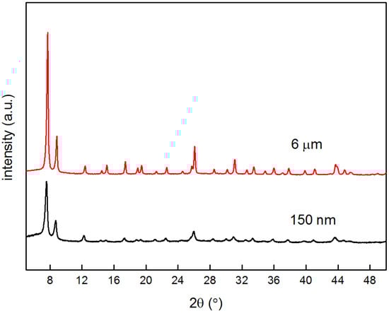 150 nm and 6 μm UiO-66 samples were characterized by XRD, SEM, and a porosity analyzer. Figure 3 shows the two sizes of UiO-66 XRD patterns that corresponded to the typical UiO-66 structure [21], which indicates that the introduction of fluorine did not lead to any destruction or disorder. Furthermore, the 6 μm UiO-66 from fluorine-involved synthesis presented sharper and narrower diffraction peaks than the fluorine-free UiO-66, which illustrates high crystallinity with the formation of larger crystals.