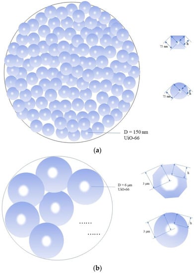 To validate the analytical results from Equation (5), the diffusion depth was empirically determined from the adsorption measurements with two crystal sizes of MOFs. For the same adsorption tube, the cross-sections of the two crystal sizes of the UiO-66 packing schematic diagram are respectively shown in Figure 5. Since the pore sizes of the two UiO-66 crystals were identical, the cubic root of adsorption capacity per pore volume was proportionally related to the molecular diffusion depth inside the pores. Assuming the pores were straight cylinders, the diffusion depth can be calculated by Equation (6):