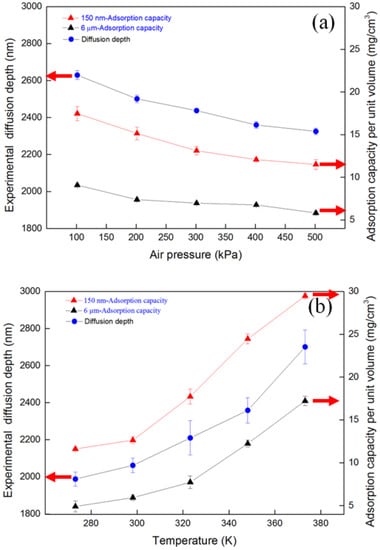 Figure 6 shows the diffusion depths calculated from Equation (6) under different air pressures and air temperatures. From Equation (6), it can be seen that the decrease or increase in diffusion depth as a function of air pressure or temperature is the cube root of the quotient of the 6 μm UiO-66 and the 150 nm adsorption capacities. The diffusion depth increase leads to a significant adsorption capacity increase in general. By differentiating Equation (5) with respect to P or T, it was found that the diffusion depth was inversely proportional to the air pressure but proportional to the air temperature. It can be found that the effect of temperature increase (100 K) on the diffusion depth was much greater than the effect of air pressure increase (400 kPa). The empirically measured data agree with the analytical calculation in the same trend.
