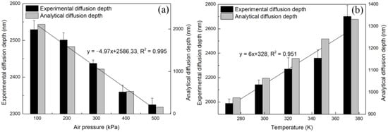 Experimental and analytical diffusion depths under different (a) air pressures and (b) air temperatures.