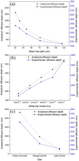 A comparison of diffusion depths between analytical and empirical data with different (a) mean free paths; (b) molecular kinetic energy; (c) molecular polarities.