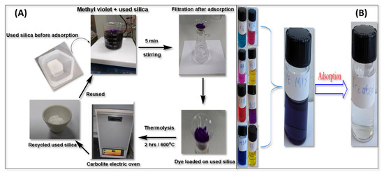 (A) Process of the adsorption of methyl violet from an aqueous solution on used silica gel, recycling of the silica gel, and reuse of the sorbent material. (B) Selective adsorption of a dye mixture containing 8 dyes (designated as solution A in the text).