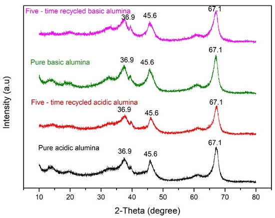 The X-ray diffraction pattern (XRD) of acidic alumina and basic alumina before the first adsorption and after five-time regeneration is given in Figure 2. It was discovered that all peaks found in the pure acidic alumina were retained after the five-time adsorption–desorption process. Furthermore, the XRD patterns of pristine basic alumina and basic alumina after five-time regeneration corresponded to each other. This shows that the sorbent materials showed no structural changes when heated to 600 °C. The broad peaks at 2-theta = 32.6°, 36.9°, 45.6°, and 67.1° were matched to single-phase aluminum oxide, XRD pattern JCPDS file no. 00-047-1770, and to that of acidic alumina [24].