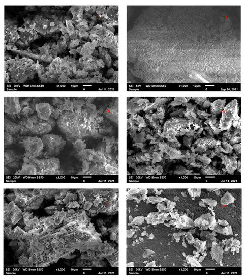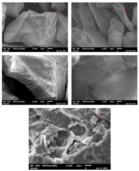 The microgram images of all the adsorbent materials used in this study are shown in Figure 3. In general, the microimages of the sorbent materials before the first adsorption and after the five-time regeneration were used to investigate whether there were no changes in the sorbent materials that could affect their adsorption capacity after thermal treatment. In the SEM image of alginite before adsorption (Figure 3i), it appeared that the alginite was porous with a rough surface and included an agglomeration of smaller particles. However, for the recycled alginite (Figure 3ii), the surface morphology changed significantly with the first regeneration. This change in surface morphology can be viewed in Figure 3i,ii. The surfaces of both the acidic and basic alumina before the first adsorption and after the five-time regeneration (Figure 3iii–vi) were rough and no appreciable change in the morphology was noted. This could explain why there were little or no differences in the adsorption capacity of the pristine and the recycled acidic and basic alumina materials used. The surfaces of the used silica before adsorption (Figure 3vii) and after five-time regeneration (Figure 3viii), the surfaces of pristine coarse silica (Figure 3ix), and the one-time regenerated coarse silica (S1(x)) were all smooth. The surfaces of the activated coffee grounds before the first adsorption process were rough and showed flaky protuberances.