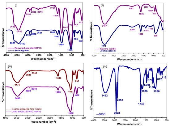 FT-IR spectra of (i) alginite before adsorption and after the first-time regeneration at 600 °C. (ii) Alumina (acidic and basic). (iii) Coarse and used silica gel. (iv) Activated coffee grounds (ACCG).