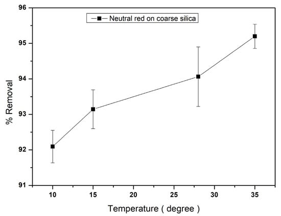 An important factor in the adsorption process is temperature. Here, the effect of temperature was illustrated on the adsorption of neutral red dye on coarse silica. For this study, the dye neutral red was selected because it is among the most common dyes used for staining purposes in educational and research laboratories. Coarse silica takes longer to adsorb dye molecules and it has a relatively low adsorption capacity. For the other silica and alumina sorbent materials used in this study, it will be difficult to ascertain the behavior of the adsorption of dyes within a very short adsorption time of 5 min. As shown in Figure 5, the largest adsorption capacity of coarse silica and the highest percentage removal of neutral red were found to be at 35 °C (308 K). As the temperature increased from 283 K to 308 K the percentage removal of the neutral red dye increased. These findings could be related to the increase in collision efficiency between the auxochrome group (N+(CH3)2) of the neutral red and the coarse silica as the adsorbent. Additionally, the higher temperature tends to enhance the deprotonation of the adsorption functional group leading to more adsorption sites for the binding of the N+(CH3)2 [42].