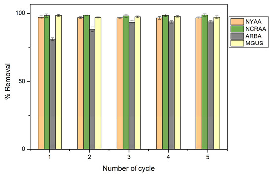 Effect of the number of regeneration cycles on the percentage removal of dyes (NYAA: Novacron Yellow on acidic alumina; NCRAA: Novacron cherry red on acidic alumina; ARBA: Alizarin red on basic alumina; MGUS: methyl green on used silica).
