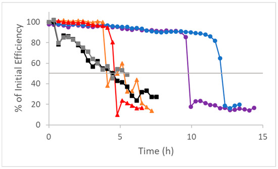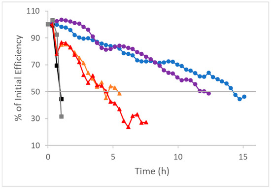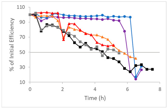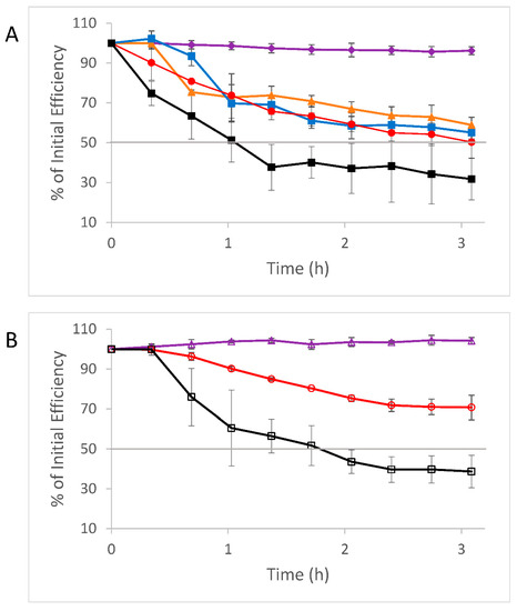 - Law, B.; Chan, P.F. Stability of silica packing materials towards a mixed aqueous-organic eluent at alkaline pH. J. Chromatogr. 1989, 467, 267–271. [Google Scholar] [CrossRef]