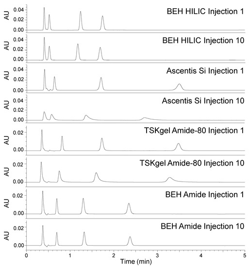 - Grumbach, E.S.; Diehl, D.M.; Neue, U.D. The application of novel 1.7 μm ethylene bridged hybrid particles for hydrophilic interaction chromatography. J. Sep. Sci. 2008, 31, 1511–1518. [Google Scholar] [CrossRef]