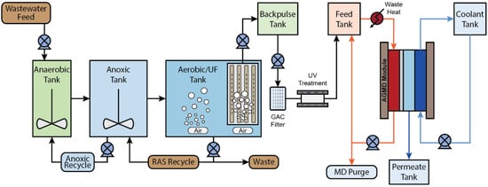 Membrane bioreactors (MBRs) are an increasingly popular secondary wastewater treatment method that may be suitable for potable reuse schemes. MBRs consist of a biological reactor (or a series of anaerobic, anoxic, and aerobic biological reactors with internal recycles) coupled with a submerged or side-stream MF/UF/NF membrane []. Whereas the biological treatment is effective at removing organic carbon, phosphorus, and ammonia [], the membrane is effective against viruses and other macromolecules that may be present in the influent wastewater []. Compared to traditional secondary wastewater treatment methods such as conventional activated sludge (CAS), MBR systems exhibit higher removals of chemical oxygen demand (COD; 97%) [,], phosphate (PO43−; 98%) [], total nitrogen (TN; 94%) [], and total suspended solids (TSS; 99%) [], which results in higher-quality effluent. Other benefits of MBRs over CAS include a smaller footprint [] and less excess sludge production [,,]. The main disadvantages of MBRs are membrane fouling and increased energy consumption [,]. Additionally, MBRs can be followed by post-treatment membrane processes such as reverse osmosis (RO) or membrane distillation (MD) to achieve higher-quality effluent. Although traditionally used for seawater desalination, MD has high average rejections for COD (98%) [], PO43− (91%) [], and TN (98%) []; MD post-treatment can result in high-quality effluent. Furthermore, the incorporation of MD with waste heat or solar thermal energy [] makes it a more viable and energy-efficient alternative to RO.