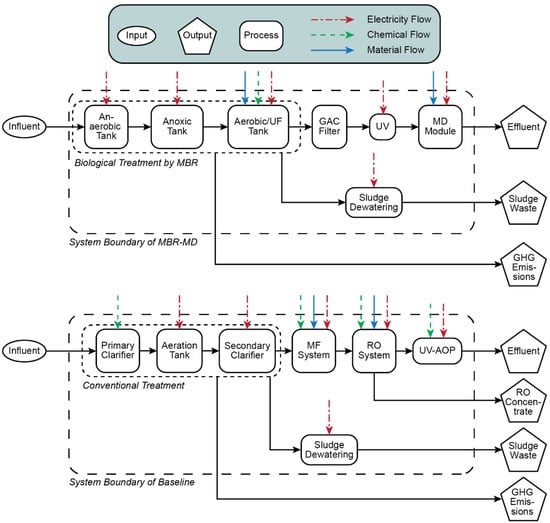 It was assumed that the direct CH4 and N2O emissions from the biotreatment were completely discharged into the atmosphere, rather than utilizing any GHG-capturing technologies. It was also assumed that the treated effluent from both the Baseline and MBR-MD systems was discharged to groundwater for IPR. The materials acquisition, construction, and decommissioning of the plants were excluded from the system boundaries to focus solely on the operation of the two systems.