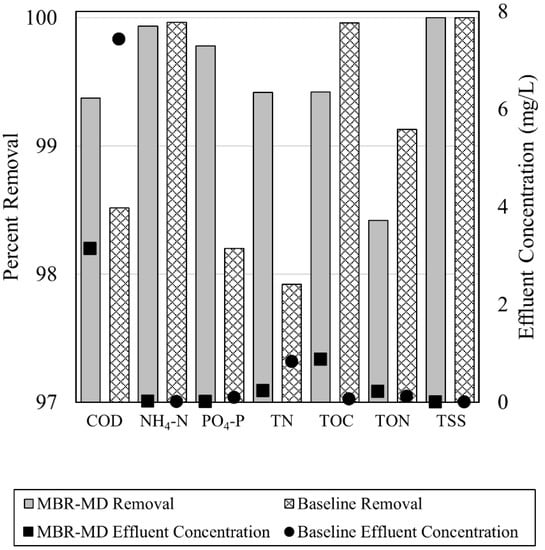 Effluent water quality results for the MBR-MD and Baseline system models and overall percent removal values for chemical oxygen demand (COD), ammonia (NH4–N), phosphate (PO4–P), total nitrogen (TN), total organic carbon (TOC), total organic nitrogen (TON), and total suspended solids (TSS).