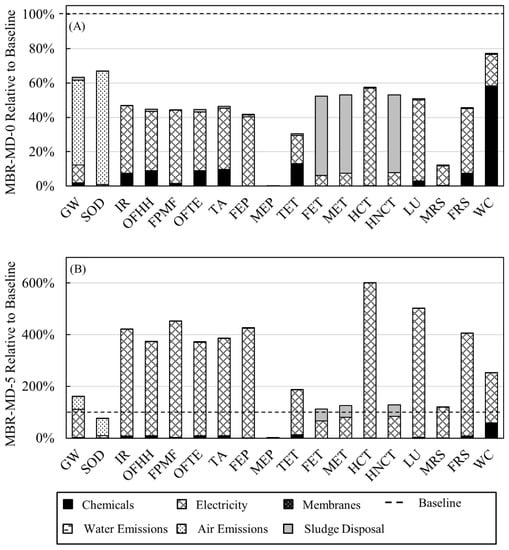 Percentage contributions to each category for the MBR-MD system scaled to the total Baseline impacts for (A) MBR-MD-0 (using all MD energy requirements satisfied with waste heat); or (B) MBR-MD-5 (grid electricity supplying 5% of the MD energy requirements with the remaining 95% of energy needs satisfied by waste heat).
