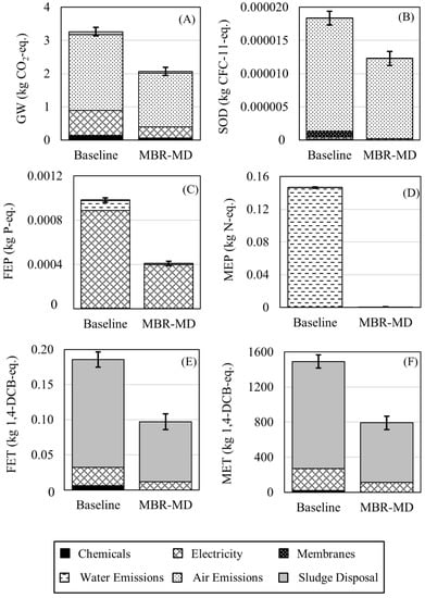 Six of the impact categories are examined in more detail for both systems (Figure 5). These six impact categories were selected because GW and SOD are valuable indicators for climate change; FEP and MEP are important categories for eutrophication often associated with wastewater effluents, and FET and MET were included due to the notable contribution of sludge waste on ecotoxicity. Environmental impacts for the MBR-MD-0 configuration were reduced by 31.0%, 44.8%, 50.9%, 99.9%, 43.2%, and 42.1% of the Baseline for the GW, SOD, FEP, MEP, FET, and MET, respectively.