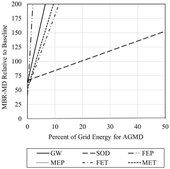 However, when grid electricity is used to supply a portion of the MD energy requirements, environmental impacts increase substantially. Figure 4B shows the MBR-MD impacts relative to the Baseline when grid electricity supplies only 5% of the MD energy requirements (MBR-MD-5). HCT shows the largest increase in this regard with total impacts at 600% of the Baseline. SOD and MEP are the only impact categories to maintain a total environmental impact less than the Baseline at 61.7% and 0.30%, respectively. For the 5% grid energy configuration, SOD is the only impact category where electricity consumption is not the largest contributor.